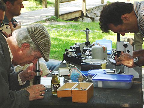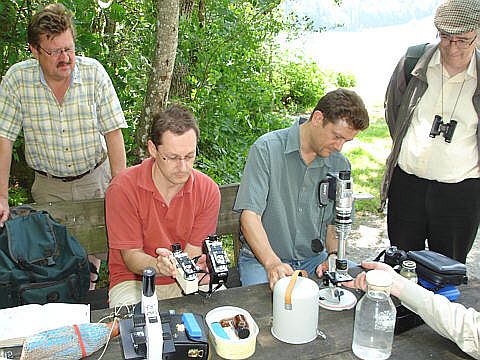 Die Mikroskope konnten auf einem Tisch, direkt am Seeufer aufgebaut werden. Auf dem linken Bild vergleicht B. K. (im roten Hemd) zwei Exkursionsmikroskope umgekehrter Bauart von Swift, und M. L. blickt in den Kameramonitor auf seinem Exkursionsmikroskop Meopta AZ1. Auf dem rechten Bild schaut H. H. (mit Mütze) in sein Exkursionsmikroskop Hensoldt Tami.