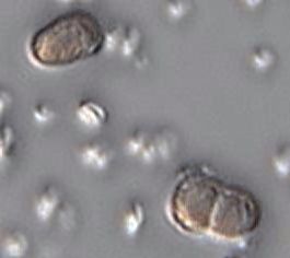 Eine von Herrn Hoc fixierte und am folgenden Vereinsabend verteilte Probe zeigt jedoch im Bodensatz erhebliche Mengen an kleinen, kugelförmigen Strukturen (Durchmesser ca. 4 Mikrometer), darunter viele im Teilungsstadium: die gesuchten Schwefelbakterien. Im Bild: Ein rotes Schwefelbakterium der Probe aus der Gattung Chromatium in einem Teilungsstadium.