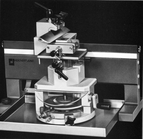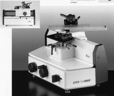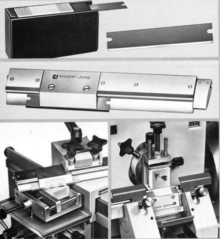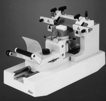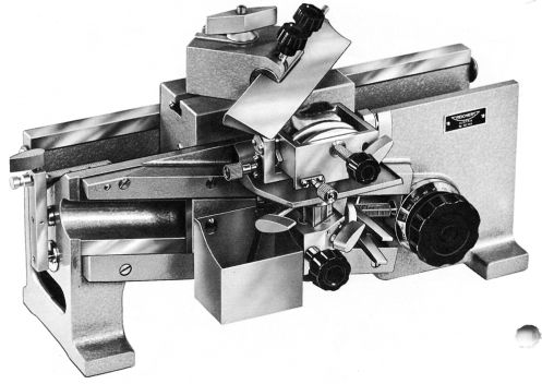 Großschnittmikrotome und solche für besonders hartes Material, wie z. B. das Tetrander von Jung, für großflächige Organschnitte (Gehirn u. a.), oder das Sägemikrotom für sehr hartes Material, wie nicht entkalkte Knochen, Glas oder Keramik, runden die Palette ab. Da sich diese Zusammenstellung vorwiegend an Amateurmikroskopiker richtet, soll noch ein Sondertyp erwähnt sein, der in letzter Zeit über Internetauktionen auch den Weg nach Mitteleuropa findet: