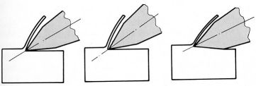 Für die Winkel der Deklination und Inklination können keine allgemeingültigen Angaben gemacht werden. Sie hängen nicht nur von der Individualität des jeweiligen Messers ab, sondern auch von der Härte und Konsistenz des Objekts und des Einbettungsblocks, aber ebenfalls in hohem Maß von der Lufttemperatur und -feuchtigkeit im Arbeitsraum, der Strahlungswärme der Arbeitslampe am Mikrotom, der Temperaturdifferenz zwischen Block und Messerklinge, der Geschwindigkeit des Messerschlittens usw. Die optimale Einstellung bleibt deshalb meist Ergebnis der Methode "Versuch und Irrtum". Die wichtigste Voraussetzung für den guten Schnitt ist und bleibt aber die Qualität der Messerschneide. Und die ist oft weniger gut, als der Mikroskopiker meint. Dennoch sollen hier einige Hinweise zur Einstellung am Mikrotom gegeben werden. (Nach R. Jung, 1958) Die Messerneigung beim SchneidenIn alten Mikrotomie-Anleitungen liest man, daß die untere Facettenkante parallel zur Schnittebene ausgerichtet sein solle. Das hat sich im Lauf der Jahrzehnte als Trugschluß erwiesen. Die Praxis am Mikrotom hat gezeigt, daß die besten Ergebnisse bei einem Freiwinkel von 3-5° erzielt werden. Verringert man ihn, d. h. stellt das Messer flacher, so wird der Schnitt stärker gestaucht, es entseht dann abwechselnd ein dicker und ein dünner Schnitt, oder das Messer gleitet sogar über den Block hinweg. Stellt man es steiler, dann wirkt die Schneide hobelartig, bohrt sich in den Block und es kommt vor allem bei den beiden schlank ausgeschliffenen Schneiden der Schlifftypen A und B durch Schwingungen zu Querwellen im Schnitt. Bei der Firma Jung entspricht der Skalenwert "0" am Messerhalter einem "Anstellwinkel"(Freiwinkel alpha plus unterer Abzugswinkel delta) von 10°, und der untere Abzugswinkel delta der von Jung geschliffenen Messer beträgt 5°. Ändert sich der Abzugswinkel, so wird zwangsläufig der optimale Bereich des Freiwinkels verlassen.