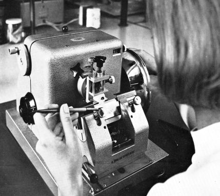 Das Schneiden in der MikroskopieVierter TeilDas Schneiden mit dem Mikrotomvon Klaus HenkelDie Vorteile des MikrotomschneidensVergleiche der Instrumente Rasiermesser und Mikrotom sowie der Komplexität der Schneideverfahren mit ihnen lassen eine Vielzahl von Vorteilen des Mikrotomschneidens gegenüber dem Handschnitt vermuten. Doch dem ist nicht so. Die Vorteile des Mikrotomschneidens lassen sich sehr kurz zusammenfassen: - Anfertigung von Schnitten gleichbleibender, definierter Dicke; Die wesentlichen Vorteile gegenüber dem Handschnitt sind damit schon aufgezählt. Aber es sind entscheidende Vorteile in der klinischen Mikroskopie, der Anatomie und der biologischen Forschung, derjenigen Fachgebiete also, in denen zahlenmäßig bedeutende Anteile von mikroskopischen Präparaten hergestellt werden. Als Nachteil des Mikrotomschnitts schlägt schwer zu Buch, daß die Einbettung der Objekte zeitraubend, teilweise kompliziert ist und etliches an Verbrauchsmaterial wie Chemikalien und - je nach erwünschtem Komfort - an technischen Einrichtungen erfordert. Ganz anders liegt die Situation bei modernen lichtmikroskopischen Verfahren und der Elektronenmikroskopie, die allesamt ohne ausgesprochene Mikrotom-Dünnschnitte gar keine Grundlage hätten. Variiert die Schnittdicke für die herkömmliche Lichtmikroskopie noch zwischen 10 und 50 µm, bei modernen Verfahren zwischen 0,5 und 10 µm (Dünnschnitte), so benötigt man für die Elektronenmikroskopie mit Vergrößerungen bis 100.000fach und einem mehrfachen davon normalerweise Schnittdicken in der Größenordnung von 10 nm (Ultradünnschnitte). Wie in der Anatomie der Handschnitt zur anfänglichen Orientierung dienen mag, so übernimmt diese Rolle für die Elektronenmikroskopie der Mikrotom-Dünnschnitt. Zurück zum Seitenanfang Die MikrotomtypenJedes Mikrotom besteht im wesentlichen aus drei Hauptteilen: