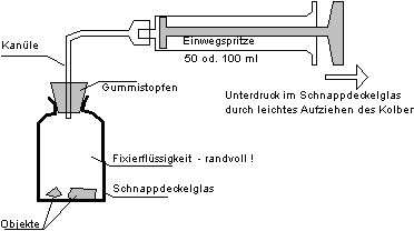 Präparate entlüftenDamit das Fixiermittel oder die Farblösung rasch in die Zellen und Interzellularräume eindringt, muß besonders aus pflanzlichem Gewebe zuvor die Luft entfernt werden, sonst behindert sie das Eindringen von Flüssigkeiten. Das geschieht schnell, wenn in dem Behälter Unterdruck herrscht, der die Luft aus dem Gewebe zieht. Traditionell benützt man dazu eine Wasserstrahlluftpumpe, die an eine Wasserleitung angeschlossen wird. Der Wasserstrahl fließt durch ein Rohr von oben nach unten und reißt aus einer seitlichen Düse in der Röhrenwand Luft mit, die mit einem Schlauch aus dem Präparateglas gesaugt wird. Dadurch entsteht dort der notwendige Unterdruck. Leider gibt es in vielen Wohnungen, vor allem in Mietshäusern keine Wasserhähne mehr, auf welche die üblichen Labormuffen passen, denn an die modernen "Designer"-Wasserarmaturen in Küche und Bad kann man keinen Schlauch mehr anschließen. Ordentliche Wasserhähne findet man allenfalls noch in Gemeinschaftswaschküchen oder am Autowaschplatz in der Tiefgarage. Weitere Nachteile der Wasserstrahlpumpen: Solche aus widerstandsfähigem Labor-Kunststoff sind teuer, die aus Glas brechen leicht. Die Apparatur funktioniert nur einwandfrei mit einem Rückschlagventil. Das alles ist unnötige Labortechnik. Unser Mitglied Johann Gerhold hat uns einmal an einem Vereinsabend gezeigt, wie es einfacher und geht. Nicht etwa motorisch mit elektronischer Steuerung, sondern nur einfacher. Man bittet seinem Hausarzt oder die Laborchefin im nahen Krankenhaus um einige neue oder gebrauchte Perfusions- oder Injektionsspritzen aus Kunststoff, Einmalspritzen in der Größe 50 bis 100 Milliliter. Dann macht man sich eine Vorrichtung wie die folgende. Das Bild erklärt alles. ![]() Der Unterdruck reicht, um alle Luftblasen in kurzer Zeit aus einem Stückpräparat oder einem dicken Handschnitt zu holen. Man zieht den Kolben nur ein wenig an, bis Luftblasen emporsteigen, dann läßt man ihn vorsichtig und nicht zu schnell wieder zurück gleiten. Von neuem anziehen bis Luftblasen kommen, anschließend wieder nachgeben. So entlüftet man schonend, weil stufenweise. Denn zieht man den Kolben zu weit, kann der Unterdruck so groß werden, daß die hinausstrebenden Luftblasen Objektteile mit hinaus drängen oder den Schnitt völlig zerreißen. Zylinder und Kolben sind auch bei einer gebrauchten Kunststoffspritze so präzise und dicht, daß man sie jahrelang verwenden kann.